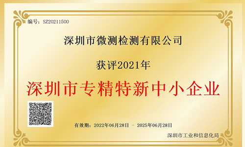 近日,深圳市工業和信息化局公布了《2021年度深圳市“專精特新”中小企業公示名單》,深圳市微測檢測有限公司榮登榜單,并榮獲深圳市工業和信息化局頒發的《深圳市專精特新中小企業》證書。